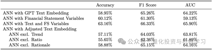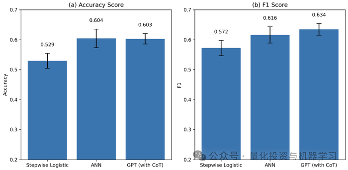 这里包括逐步逻辑回归和人工神经网络(ANN)。结果显示,GPT的预测性能与这些专业模型相当,甚至在某些情况下更优。