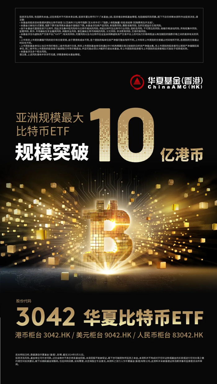 截至2024年5月31日,华夏比特币ETF总规模突破10亿港币大关,上市以来一直维持着规模领先的地位,是亚洲规模最大的比特币ETF。