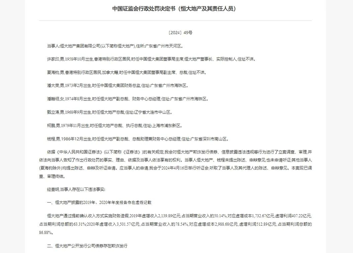 罚单显示,一是责令恒大地产改正,给予警告,并处以41.75亿元的罚款;二是对许家印给予警告,并处以4700万元的罚款;三是对潘大荣给予警告,并处以900万元的罚款;四是对潘翰翎给予警告,并处以750万元的罚款;五是对柯鹏给予警告,并处以280万元的罚款;六是对甄立涛处以200万元的罚款;七是对钱程给予警告,并处以20万元的罚款。