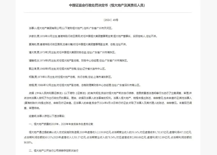罚单显示,一是责令恒大地产改正,给予警告,并处以41.75亿元的罚款;二是对许家印给予警告,并处以4700万元的罚款;三是对潘大荣给予警告,并处以900万元的罚款;四是对潘翰翎给予警告,并处以750万元的罚款;五是对柯鹏给予警告,并处以280万元的罚款;六是对甄立涛处以200万元的罚款;七是对钱程给予警告,并处以20万元的罚款。