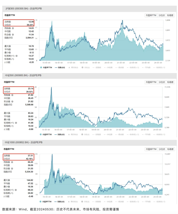 估值方面,目前沪深300指数的市盈率TTM为12.06,位于近十年39.22%分位水平;中证500指数的市盈率TTM为23.14,位于近十年29.02%分位水平;中证1000指数的市盈率TTM为37.51,位于近十年42.16%分位水平;从估值分位的角度看,目前中证500的估值处于历史相对更低的分位水平,其投资的安全边际或许更好。(历史不代表未来,市场有风险,投资需谨慎)