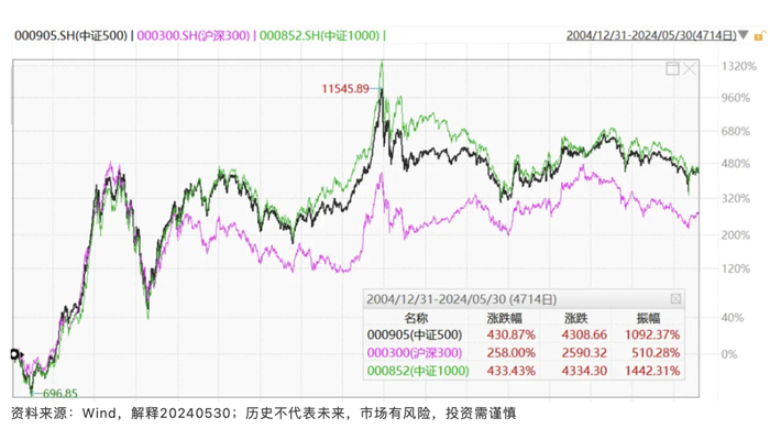 在指数历史表现方面,中证500和中证1000的历史走势非常相似,自2004年12月31日以来,截至2024年5月30日,沪深300指数累计涨幅258.00%,中证500指数累计涨幅430.87%,中证1000指数累计涨幅433.43%,单从涨幅上来看,中证1000指数略胜一筹。但从振幅来看,中证500指数历史振幅1092.37%,中证1000指数历史振幅1442.31%,中证500的历史振幅小于中证1000指数,其持有体验或许更好。(数据来源:Wind;不作为投资建议,指数涨跌幅仅供参考,不预示未来表现亦不代表具体基金表现,市场有风险,投资需谨慎)