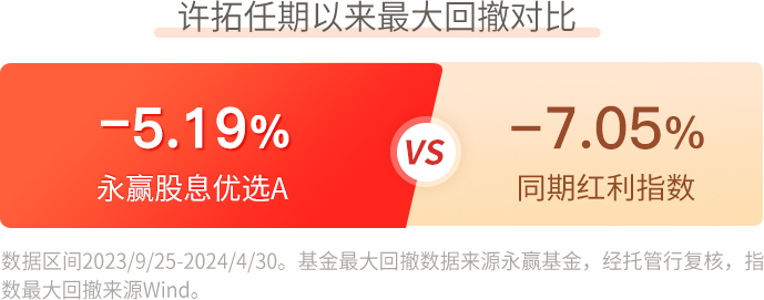 即使是逆势上涨的红利指数,也被永赢股息优选A拉开近13个点的收益差距。而且许拓任职以来永赢股息优选的最大回撤是5.19%,但是红利指数同期最大回撤有7.05%,这不就是“涨得比指数多,跌得比指数少”嘛~