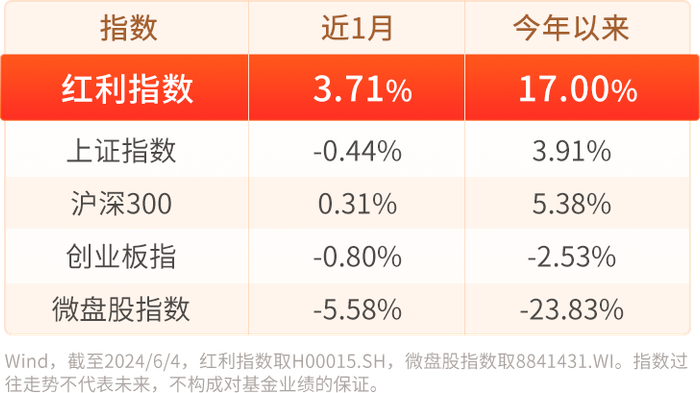 虽然红利风格持续上涨了一段时间,但是当前红利收益指数市盈率6.52倍,这个估值水平远低于沪深300(12.12倍)、创业板指(28.28倍)、科创50(44.35倍),且低于红利指数上市以来近77%的时间,长期投资性价比突出。(Wind,红利指数取H00015.SH,截至2024/6/4)