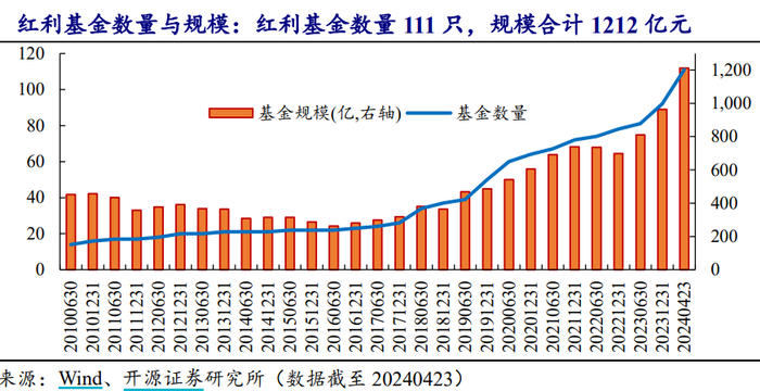 在此带动下,红利策略的基金规模也在快速增长,仅从ETF来看,今年以来红利类ETF规模增长了240亿元,仅5个月左右就超越了2023全年(194亿元)的增长水平(Wind,截至2024/6/3)。据开源证券统计,截至今年4月,被动红利基金、主动权益红利基金和量化基金规模就已经超过1200亿元。