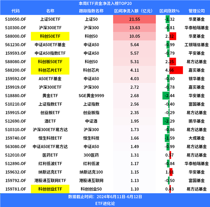 从ETF本周两天的资金流入情况来看,资金大幅买入科创相关的ETF,其中华夏基金科创50ETF、易方达基金科创板50ETF、嘉实基金科创芯片ETF、易方达基金科创创业ETF分别净流入10.05亿元、5.31亿元、4.11亿元和1.1亿元。