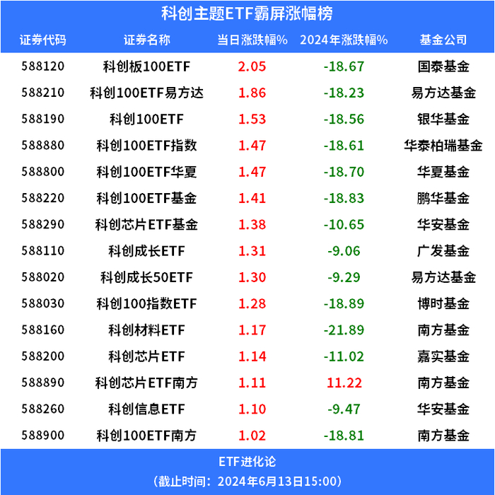 跟踪科创100指数的ETF领涨宽基指数ETF。国泰基金科创板100ETF涨2.05%,科创100ETF易方达涨1.86%,科创100ETF华夏涨1.47%。