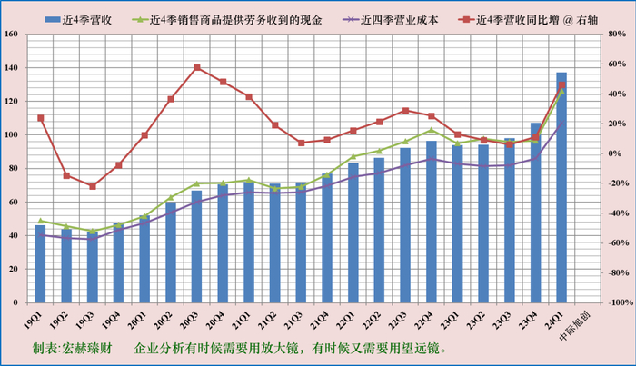 绿色折线接近或高于蓝色柱图上边,显示营业收入含金量高。