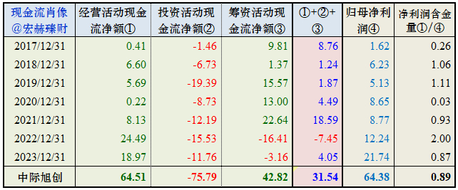 首先要关注经营活动现金流净额①要持续为正且≥归母净利润④为优(即最后一列≥1为优);其次要关注①②③项的变动趋势,从而体会公司的经营周期。此表的具体用法参看《肖星的财务思维课》和《手把手教你读财报》两本书中所述。