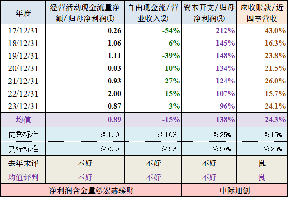 大家可以从均值以及去年度的值对照优秀和及格标准来看该公司的净利润含金量高低。战略重视有3-4个指标持续在优秀标准以上公司。