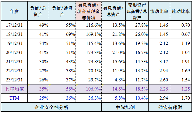 一般而言,各类负债占总资产比越小越好,无形资产和商誉占比过大会有减值风险,流动比率和速动比率分别大于2和1为好。