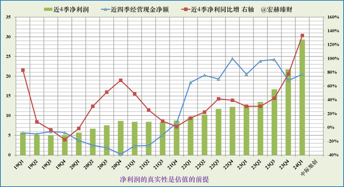 蓝色折线持续在绿色柱图上边及以上,显示净利润含金量高。