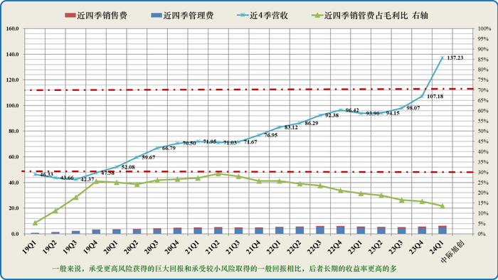 该指标用于分析公司商业模式内产生净利润能力的强弱。可关注近四季销售和管理费用与毛利润之比持续小于30%的公司,这样的公司具备较高的竞争优势(即图中绿线折线低于下红虚线为优异,靠近为优秀);若该指标处于30-70%之间(图中红色虚直线之间)为可接受区域;若大于70%需要警惕,说明该公司产生净利润的能力较弱。