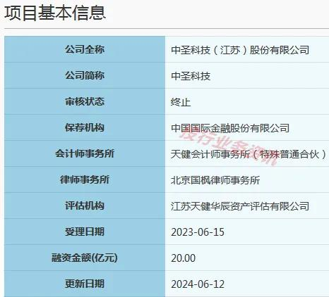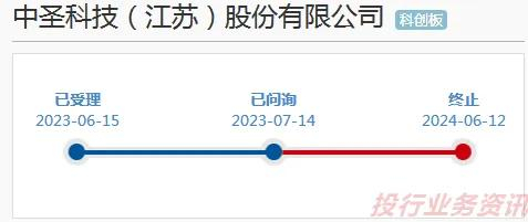 2023年7月14日,交易所发出首轮问询,截止目前发行人未回复。2024年6月12日,因中圣科技(江苏)股份有限公司及其保荐人撤回发行上市申请,上交所终止其发行上市审核。