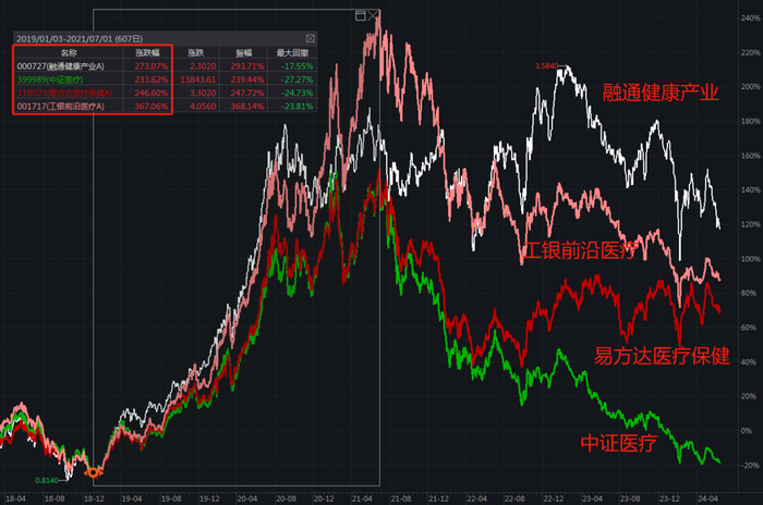 富国和银华的基金成立时间较早,也在牛市中相对医药指数跑出了超额收益,但熊市中基本是跟随的状态。