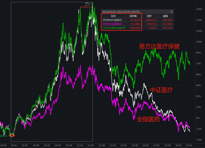 绿线是杨桢霄管的“易方达医疗保健”,牛市中涨了247%,跑赢中证医疗13个点。