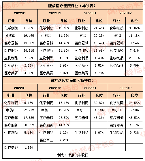 杨桢霄的仓位集中在两到三个子行业上,马牧青的行业配置相对更均衡一些,如她所说,“对医药子行业进行灵活配置,并保持合理适度均衡,以有效控制回撤”。