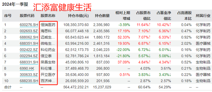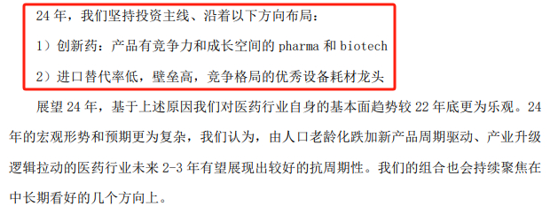 2024年一季报中,她看好创新药,以及进口替代率低、壁垒高、竞争格局优秀的设备耗材龙头。