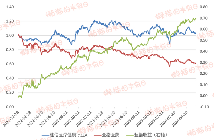 2021年12月28日开始管“建信医疗健康行业”,在长达2年半的时间里,这只基金相对医药指数取得了稳定的超额收益(绿线)。