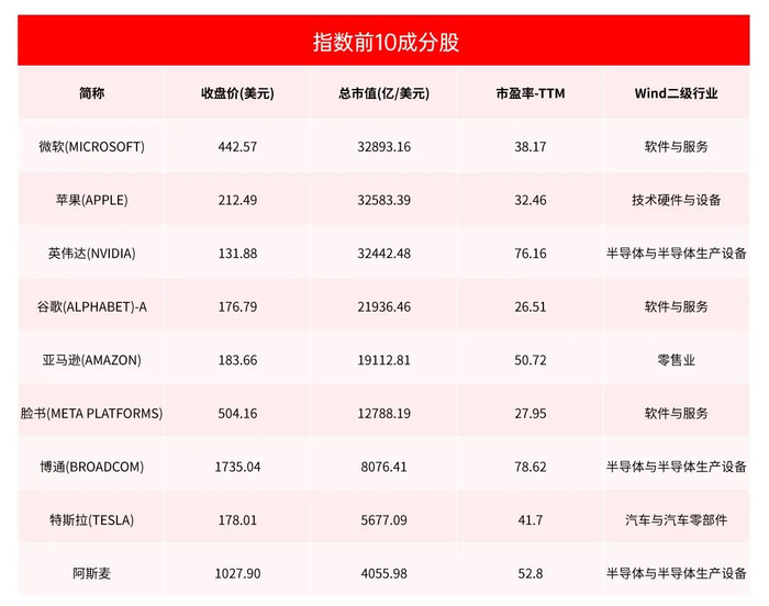 纳指被誉为“全球科技产业健康状况晴雨表”;而纳指100,是从中选择市值最高的100家公司作为成分股,前10大成分股是微软、苹果、英伟达、谷歌、亚马逊、脸书、特斯拉等,可以说是美股自己的“科创50”。