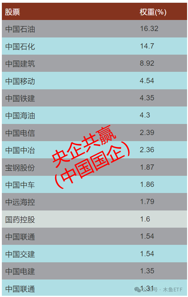 从成分股表现来看,中海油、中石油、神华、中国石化等能源巨头占据前四,接下来就是三大运营商了,一排“中”字头一字排开颇有声势!