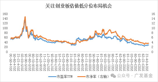 截至2024年5月29日,创业板指市盈率PE为27.84倍,位于过去3年/5年/10年11.26%、6.67%、3.33%分位的位置,当前市盈率低于过去10年96%的时间,分位数低于同期沪深300、中证500指数。目前创业板指市净率PB为3.51倍,位于过去3年/5年/10年5.30%、3.14%、3.91%分位的位置,当前市净率低于过去10年96%的时间,反映创业板指的估值处于历史较低水平,长期投资价值值得关注。