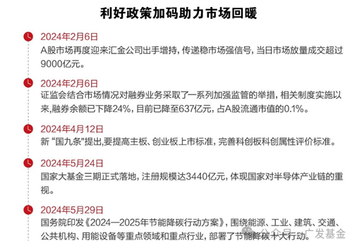 近期政策上利好频出,4月12日,新“国九条”出炉,提高创业板上市标准,鼓励创业板和科创板企业进行并购重组,将有利于提升创业板股票的内在价值。5月24日,“国家大基金三期”成立,注册规模大3440亿元,远超前两期基金,体现国家对半导体产业链的重视。5月29日,国务院印发《2024—2025年节能降碳行动方案》,部署了节能降碳十大行动,将利好光伏、储能、新能源汽车等多个行业。这些政策的实施,旨在推动新质生产力的发展,支持科技创新和产业升级,也无疑为市场注入一剂强心剂。