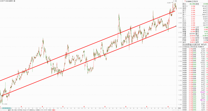 下图是红利ETF(510880.SH)的K线走势图,规模最大的红利类ETF,最新规模高达183亿元,跟踪指数是上证红利指数(000015.SH)。