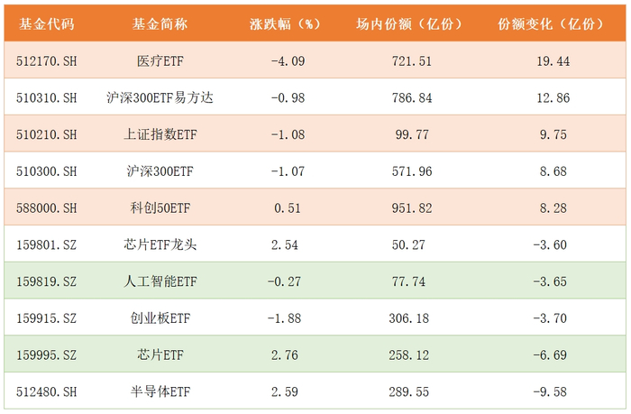 进一步看,医疗ETF512170)、沪深300ETF510310)份额增长超过10亿份,前5大份额贡献标的中宽基ETF占了4席,除此之外,本周并没有出现份额大幅流出的标的,详细数据如下: