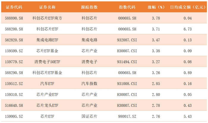 ETF涨幅榜方面,芯片相关主题包揽了九个席位,此外,汽车ETF挤进前十,涨幅都没啥惊喜,详细数据如下:
