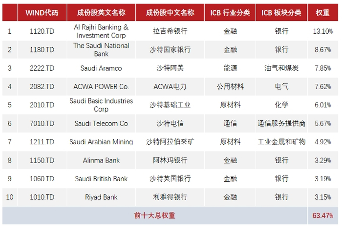 2、指数标的情况:富时沙特阿拉伯指数(指数代码:FISAULM.FI),其编制思路类似大A的沪深300,相当于一键打包沙特股市前60大上市公司,主要权重是金融、资源、公共事业,,成分股大伙看下图: