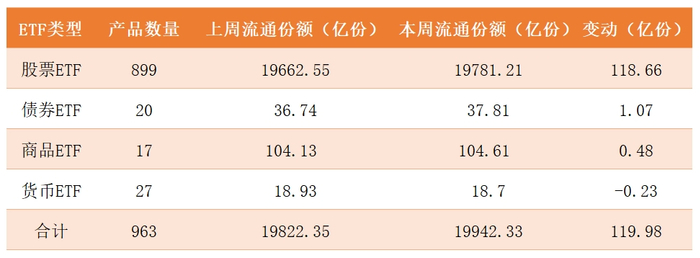 相比市场整体低迷的现状,ETF市场又是另一番景象,全周ETF市场总份额增加119.98亿份,其中股票ETF份额增长118.66亿份。
