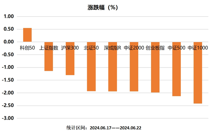 本周市场延续震荡调整态势,5月金融数据偏弱外加陆家嘴高级别会议没有超预期表态,两者叠加进一步压制了市场表现。截至周五收盘,除科创50小幅收涨外,各大宽基指数全线下跌,详细数据如下: