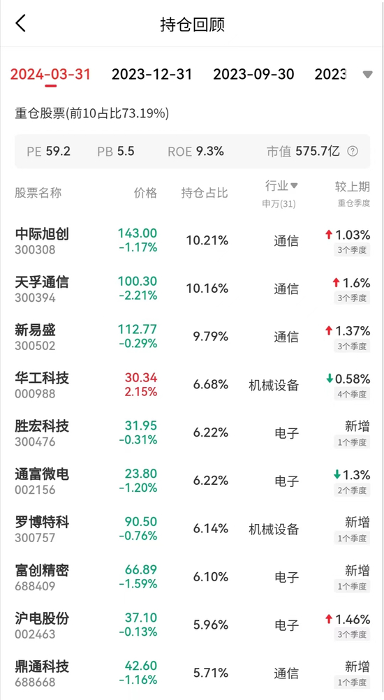 在今年一季度前十大重仓股中,前二的持仓占比都超过了10%,排在第三的新易盛也快接近10%了。