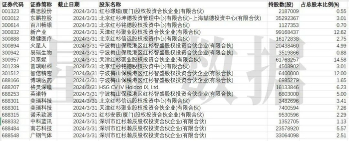 据星矿数据不完全统计,2023年8月以来,红杉中国先后减持了东鹏控股(003012)、慕思股份(001323)、百川畅银(300614)、新产业(300832)、稳健医疗(300888)、火星人(300894)、易瑞生物(300942)、普瑞眼科(301239)、博瑞医药(688166)、格灵深瞳(688207)、英诺特(688253)、奕瑞科技(688301)等12家公司。
