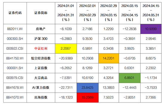 从年初以来各大板块的表现来看,市场先后出现了红利、AI 算力、出海出口、大宗商品、低空经济、地产等主线,但行业或主题的表现很多都停留在月度级别。参考年初以来的各大板块的涨幅数据如下: