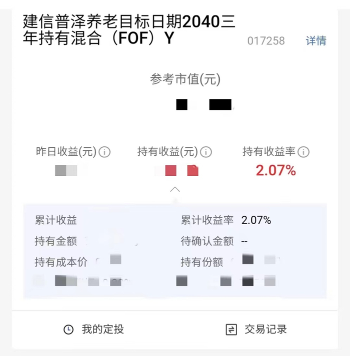 她在去年11月底,购入建信普泽养老目标日期2040三年持有混合(FOF)Y养老理财产品,此后每个月底坚持定投。