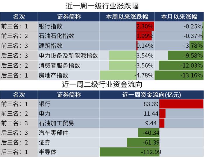 申万板块方面:银行指数、石油石化指数、建筑指数涨幅居前;房地产指数、消费者服务指数、电力设备及新能源指数跌幅居前。