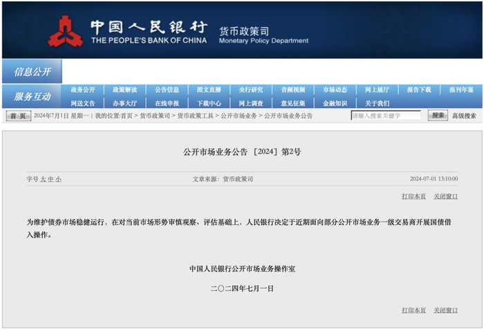 7月1日(周一),央行公告称,为维护债券市场稳健运行,在对当前市场形势审慎观察、评估基础上,决定于近期面向部分公开市场业务一级交易商开展国债借入操作。消息公布后,银行间利率债活跃券收益率下行幅度收窄,30年期国债活跃券收益率上行至2.4250%,10年期国债收益率收窄至2.2200%,国债期货全线跳水转跌。