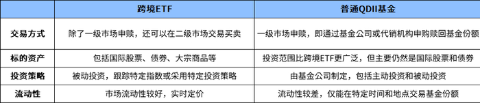 QDII指的是中国境内的合格机构投资者,被授权以人民币购买和持有境外金融市场的证券和其他金融工具,这类基金的投资范围包括国际股票、债券、商品、房地产等多个领域。QDII机制下,投资者的投资受到一定的监管和限制,以确保境外投资风险可控。跨境ETF则是国内基金公司通过跟踪境外指数、创设新的金融工具产品,以达到将基金资产投资于境外标的资产的目的。