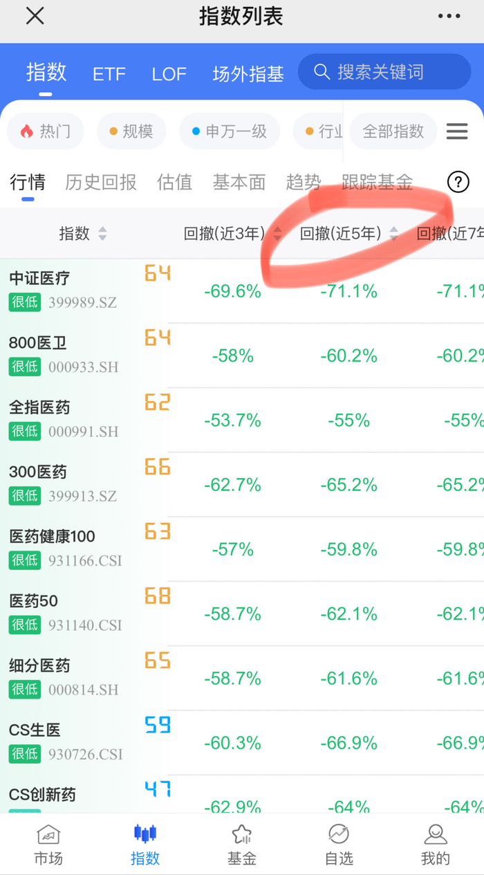 从21年的最高点算,中证医疗的最大跌幅高达71.1%,其他医药医疗类指数,普遍也有60~70%的跌幅。
