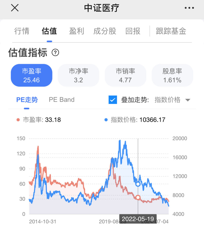下图中的红线是中证医疗的PE走势,蓝线是股价走势:
