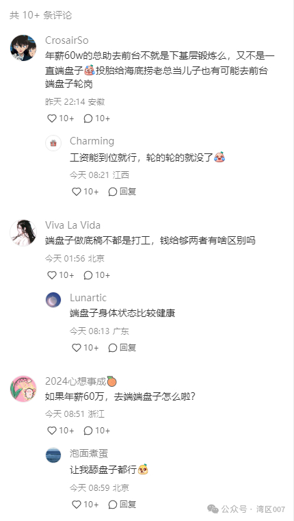 根据截图,说是有个中金的同事,打算离职,然后找工作,面了海底捞总助,说一年60万,但是要去前台端盘子轮岗。他去群面的时候,有三个人,其中一个是基金公司做投资的(这不就是投资经理或基金经理/基金经理助理吗)。