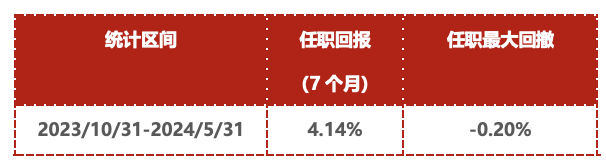 从王经瑞转任公募基金经理的7个月的时间里,交出了一份比较令人信服的答卷,从他管理的鹏扬双利A(一级债基)来看,自2023年10月31日任职以来,截至2024年5月31日(7个月)累计回报4.14%,最大回撤-0.20%,可谓是高投资性价比之选。