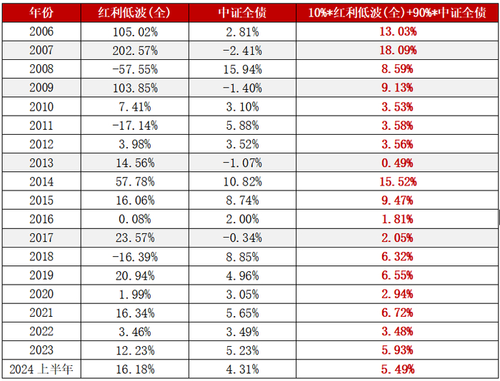 简单以中证全债指数代表债券组合,从过往表现来看,红利低波类资产和债券的“一九”组合能产生不错的化学反应,较好匹配广大投资者求稳又求进的投资需求。