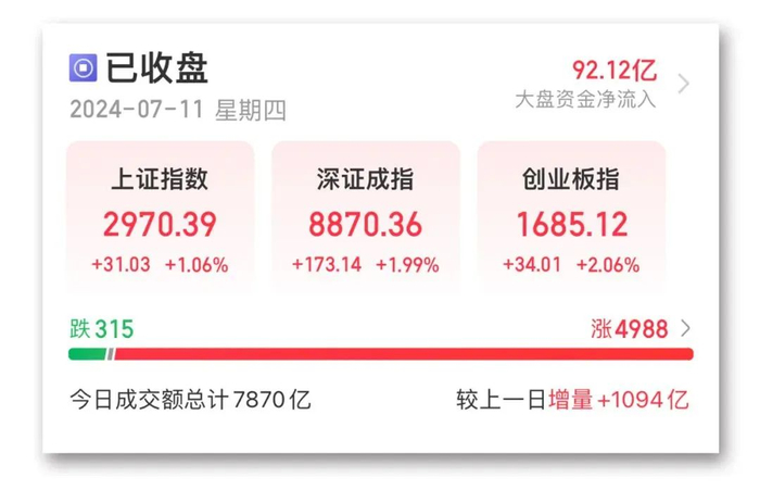 A股市场今日迎来了显著的反弹。三大指数全线高开高走,创业板指数一度涨幅超过2.5%。截至收盘,沪指上涨1.06%,深成指上涨1.99%,创业板指上涨2.06%,市场几乎全面飘红,有近5000股集体上涨。