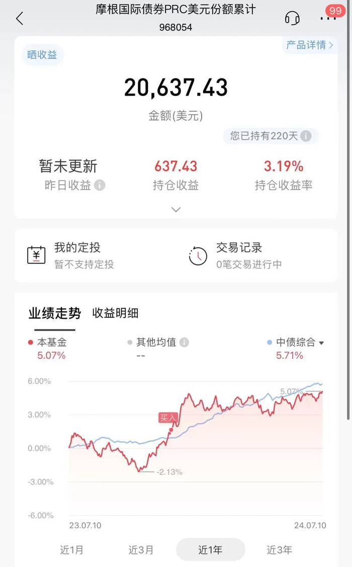 再比如,喜胖去年11月直接用美元买的一个美元债基金,持有了半年到今年4月份,才赚了不到2%,还不如博格自己一直在买的纯债汉堡(国内短债基金组合)。