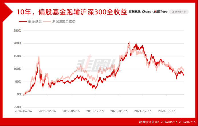 10年的时间,沪深300全收益涨了100%,但偏股基金累计涨幅80%,主动管理作为整体,跑输市场。