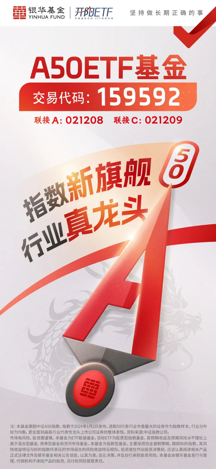 银华旗下A50ETF基金(159592)及其联接基金银华中证A50ETF联接(A类:021208,C类:021209)紧跟中证A50指数,持续捕捉新时代的核心资产,投资者或可重点关注。