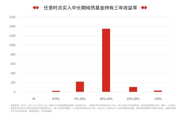 债基的两大主要收益来源是票息收益和资本利得。前者用来获取固定的利息,后者通过在二级市场交易获得差价收入。作为一个长期主义投资者,债券的票息长期来看有望抚平市场利率变化带来的价格波动。 如果乐观些,我们统计了过去十年任一时间持有中长期纯债型基金三年的收益,发现绝大多数累计收益都在10%-15%之间,投资时点或许很重要,但是拿得住更重要。